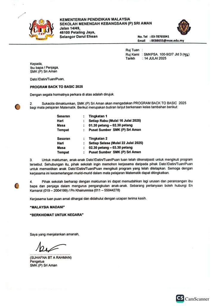 Program back to basic bagi murid tingkatan 1 diadakan pada setiap hari Rabu jam 1.30pm – 2.30pm.
