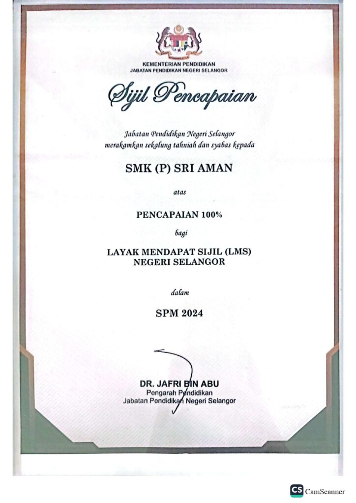 Curriculum ProgrammesANUGERAH PENCAPAIAN LMS 100% SPM 2024 NEGERI SELANGOR Norazila RazakSeptember 30, 2025October 2, 202501 mins Anugerah Pencapaian 100% layak mendapat sijil SPM 2024 Negeri Selangor. Post navigation Previous: KELAS TERBERSIH MINGGU KE-29